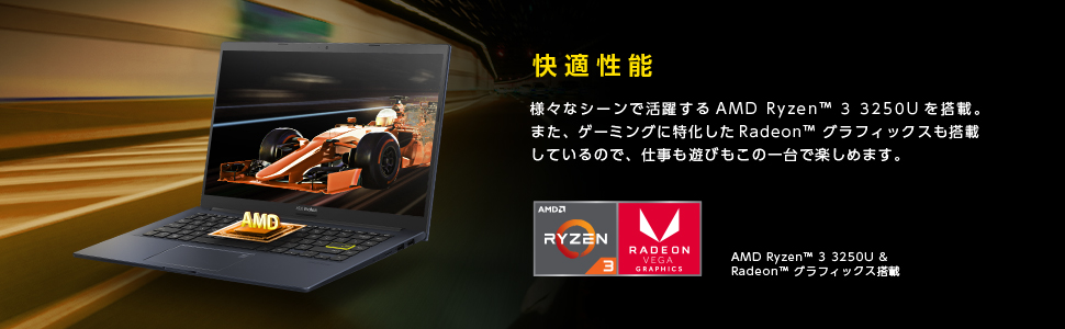 Ryzen 3 3250U ( 2 コア / 4 スレッド / 2.60 GHz / 最高 3.50 GHz / Radeonグラフィックス)を搭載する、エントリー 14 型フル HD ノート PC。厚さ 19.1 mm 重量約 1.45 kg のスリム・軽量設計で、連続約 10.1 時間のバッテリ駆動が可能。指紋認証センサーを備える。