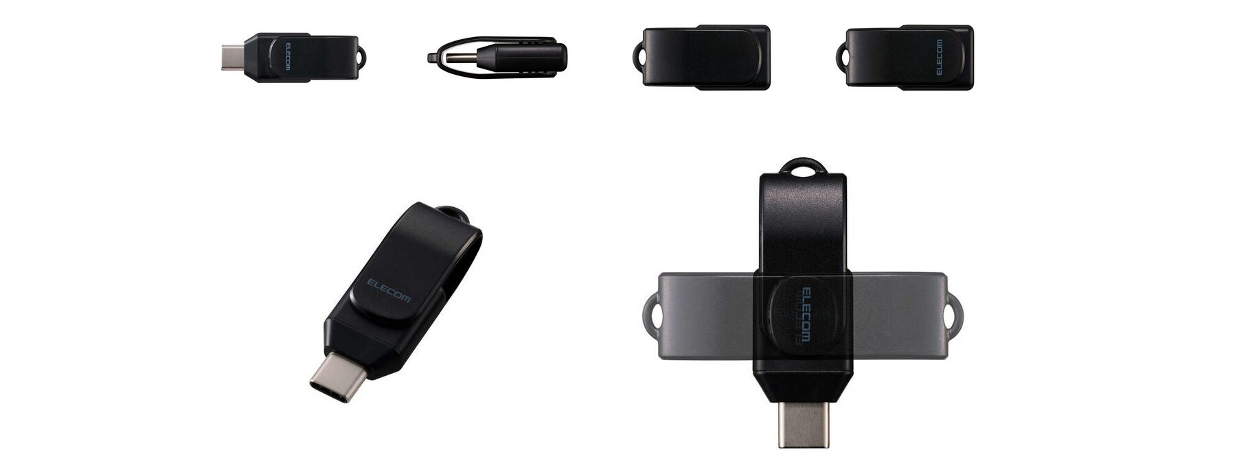 コネクタが回転して本体に収納される回転収納式を採用しているため、キャップを紛失する心配がない。さらに、エレコム製の多くのスマホケースを装着したままでも挿せるように設計されており、利便性が高い。本体は約4gと非常に軽量で携帯性に優れており、ストラップホールも付いている。